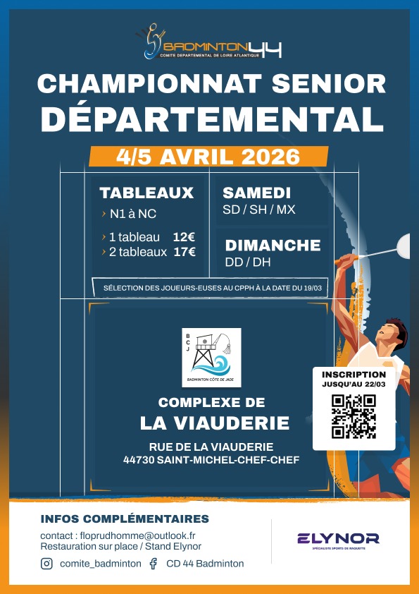 le Comité Départemental 44 (CD44) et le Badminton Côte de Jade (BCJ) co organisent, pour les joueurs et joueuses licencié.e.s dans le département de Loire Atlantique et en règle avec la FFBAD pour la saison 2025-2026, un championnat départemental seniors. Il aura lieu le samedi 04 et le dimanche 05 avril 2026, au complexe de la Viauderie, 44730 Saint Michel chef chef (12 Terrains et une salle d’échauffement). Les joueurs et joueuses seront convoqué.e.s à partir de 7h30 et les matchs débuteront à 8h00. La fin du tournoi est prévue vers 21h00 le samedi et 18h30 le dimanche.